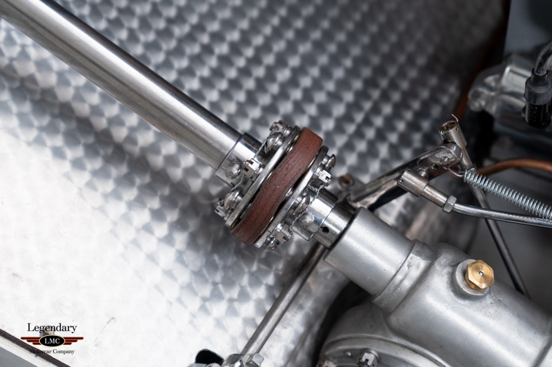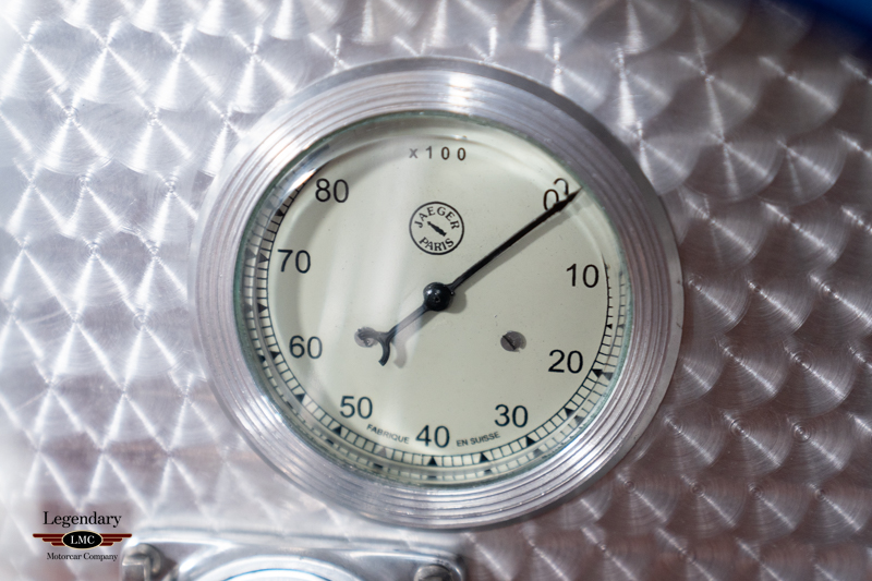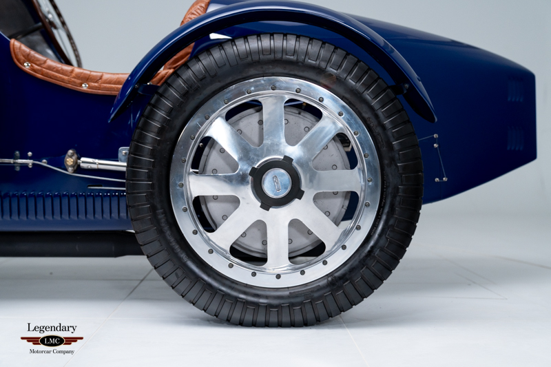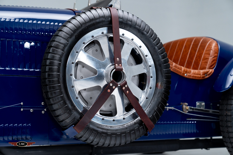 The Type 35 Pur Sang reveals the skill and passion of its creators with hand formed all-alloy, superbly finished to a high standard, and includes mudguards for road use. The cockpit features supple tan leather, which is sure to wear in like a favorite pair of gloves as you pile on the miles. Evocative period details include Marchal headlamps, a Boyce Motometer, and leather straps tying down the bonnet and side-mounted spare wheel. Ettore Bugatti’s distinctive 8-spoke alloy wheels are faithfully reproduced in cast aluminum and incorporate the brake drums as original – a clever solution to address brake wear during grueling endurance races. The wheels are wrapped with period block-tread Excelsior tires to ensure an authentic look and handling characteristics. In the snug two-place cockpit, the driver is met with just the bare necessities for piloting a Grand Prix-bred machine – just a tach, oil and fuel pressure gauges, and a clock.